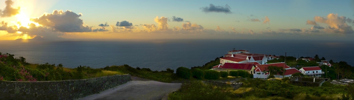 In this panoramic, morning sunbeams burst from the clouds over the islands of Statia, Nevis, and St. Kitts and illuminate the road winding down to St. John’s in front of my cottage.