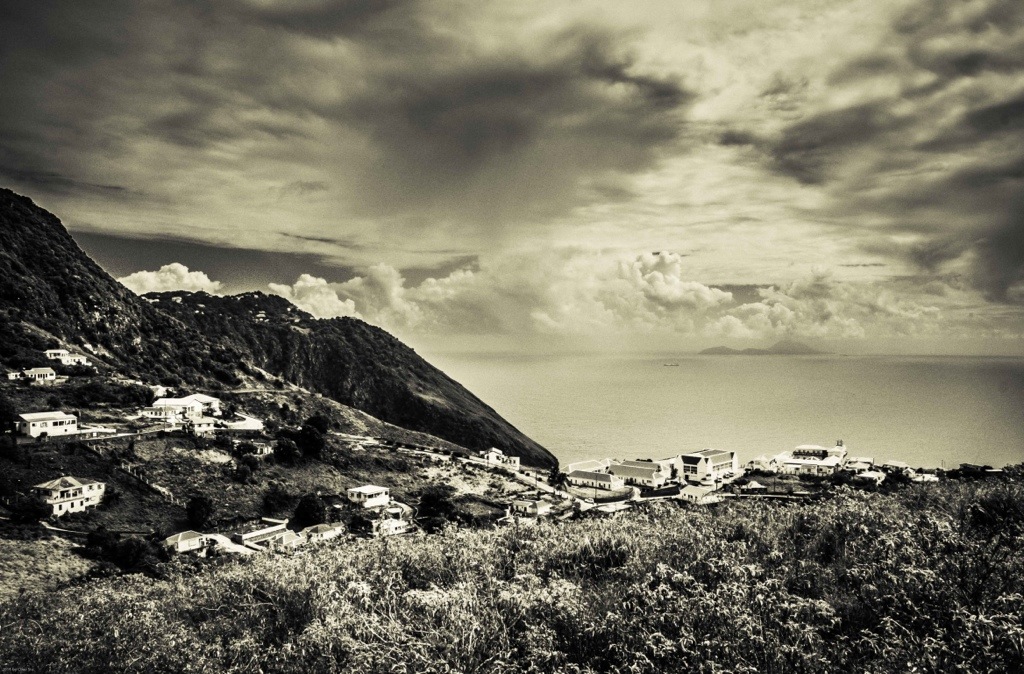 In any case, it was pretty fun up there…expectations well met. Again, the dramatic Caribbean cloudscapes on the horizon added their drama, and this is a black and white photo looking East over St Johns–Windwardside in the distance–looks like it could’ve been taken in the 40’s. Tres cool, non?