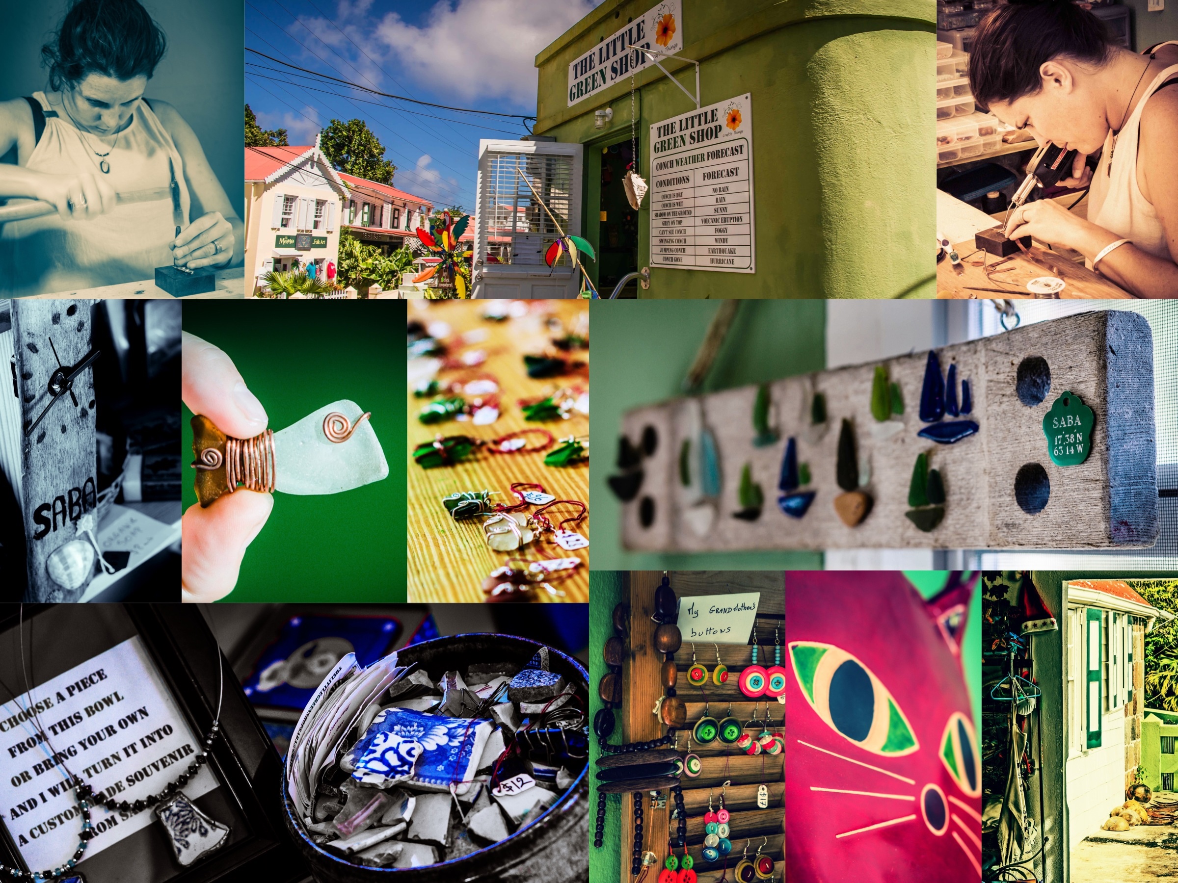 I took longer than usual to create the images that I thought captured the free roaming spirit and clever artistic details of Marie and The Little Green Shop; for such a tiny store in the corner, there’s a lot going on here with this hardworking expat who’s making a stamp in her own way in Saba’s day to day art and culture.