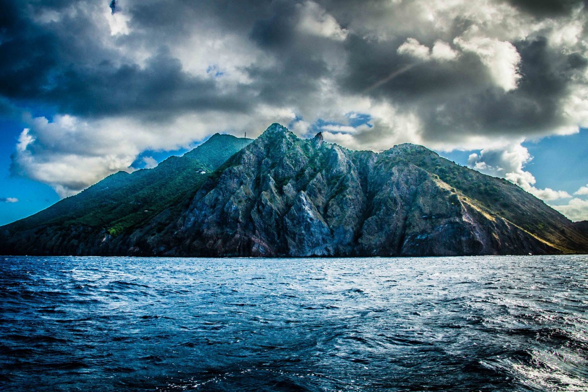 Cranking the picture colors of Saba on this pic taken on the way to diving 100 feet down to the Pinnacles yesterday–fantastic underwater site!–got me this ominous shot of the island to share; I suspect the Auld Rock is picking up the blue water reflections the naked eye doesn’t necessarily see by the bright light of the Caribbean morning sun.