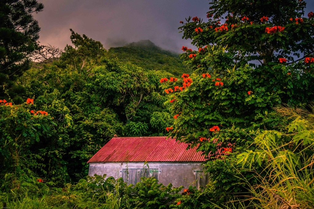 I saw the fog rolling fast over Mt Scenery, and below it, this lovely place nestled within lush foliage and flowers.
