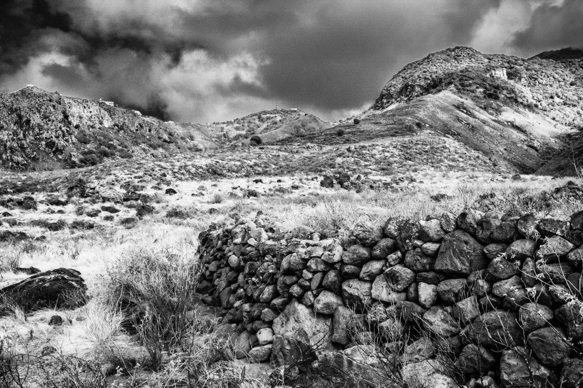 This pic is from the bone dry days of early March in Saba, rambling along the Giles Quarter coastline and aiming the camera up past the ruins of the old beekeeper rocks, the cloud on the edge of Mt Scenery to the left, Peak Hill in the center, Booby Hill and The Level to the right. Note how very dry this is….it hardly even resembles the Caribbean.