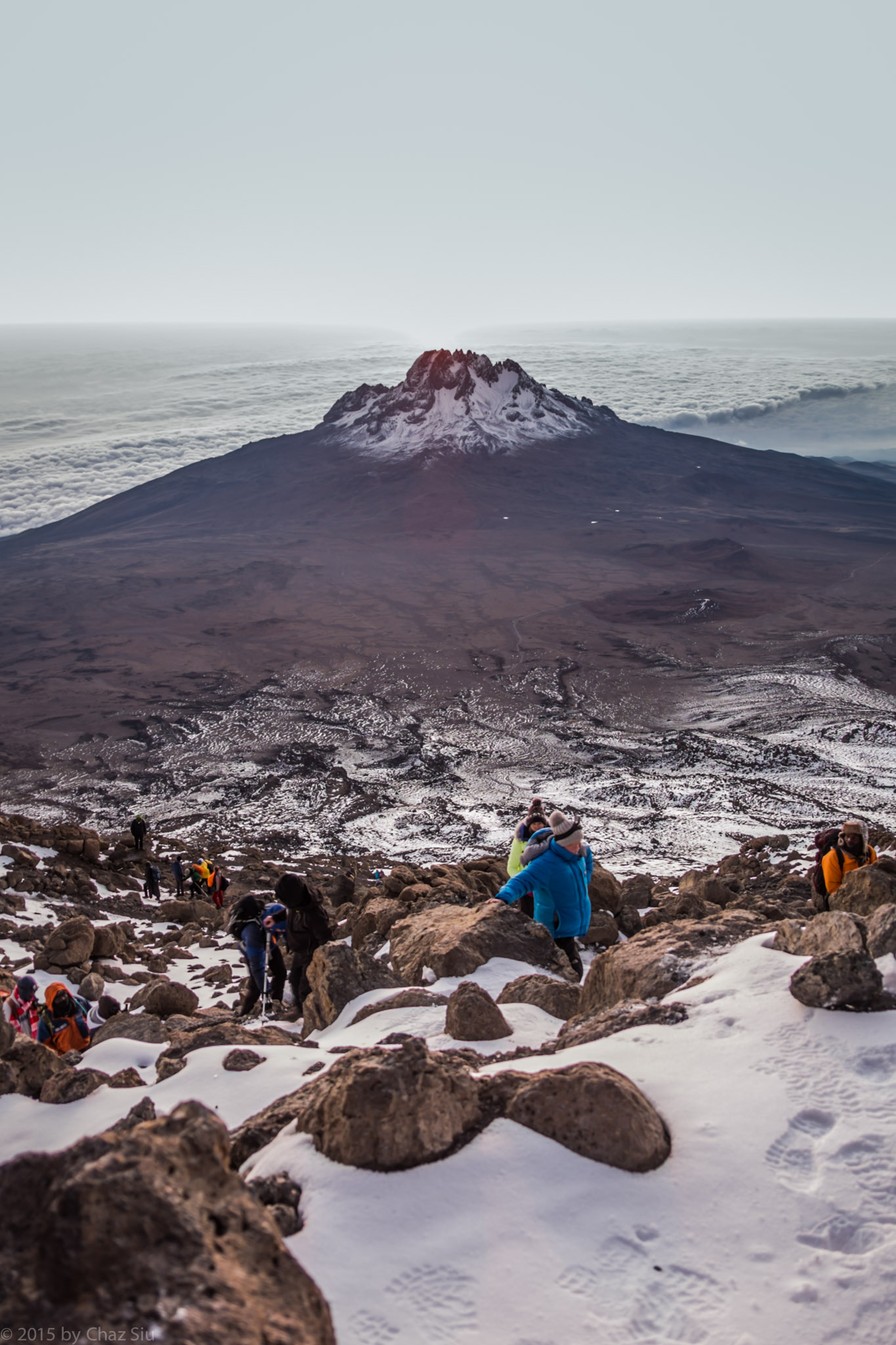 The Earth is Curved..6:30am Crater Rim Sunrise With Mawenzi and Clouds Below Us
