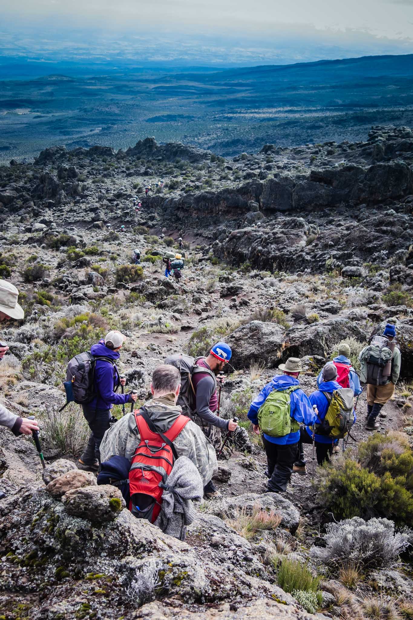 With Moir Hut at 13,632 feet and our target destination Buffalo Camp at 13,600 feet, we assumed we’d be doing a fairly flat traverse around the northern side of the mountain, but the way out of Moir Hut was a super steep switchback with 500 feet of straight elevation gain.Pole Pole pace makes these kinds of ascents not only possible, but fairly straightforward, as long as you’re not suffering any altitude effects. Caryl was in her 2nd day of on again, off again brutal headaches and combating sinuses as well, staving off Diamox for the moment, while the three members of the team on Diamox were back to normal and doing great. The rest of us marched onward to little effect, though I think Irina had mentioned a headache here and there.