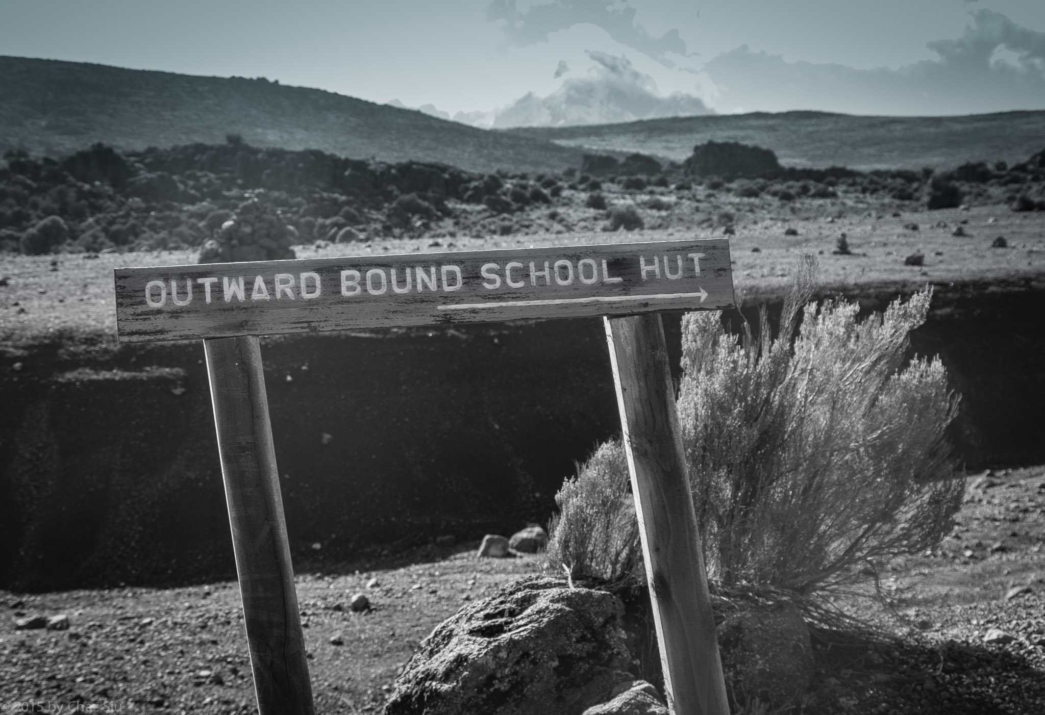 Third Cave amounted to base camp – our last full night of sleep before we summited the mountain, and the beginning of a LONG period of hiking. In the morning after breakfast, we would ascend from 13,000 feet to Outward Bound School Hut 15,500 feet, have lunch, nap, have dinner, then at 11pm, make the summit attempt. We marched out of camp at 8:27am and into the Kibo saddle that separated multipoint Mawenzi Peak on our left, and Kili Kibo Crater (the summit) on our right. The land quickly transitioned into the surface of the moon, strewn with rocks and virtually no flora to be seen.