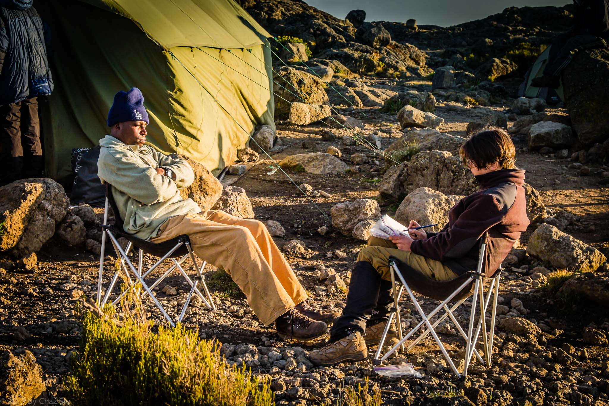At last, across a wide ravine, we saw Third Cave. The camp was situated at such a steep mountain angle, the whole thing looked a little sideways, but it was sunny, and we relished a relaxing afternoon and evening. The real ascent up Kilimanjaro would begin tomorrow. In the meantime, Caryl and JT chatted, and Caryl became team member #4 on Diamox to ease her headaches. We would see the next day.