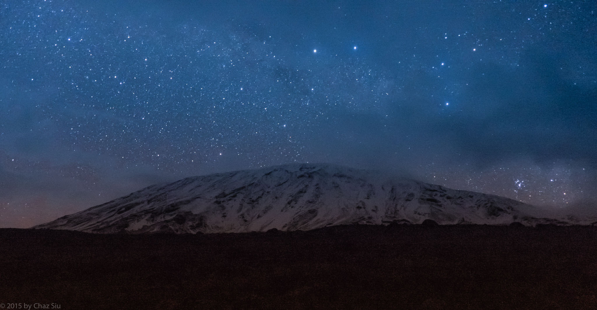 We woke up at 11pm, mist overhead obscuring the sky, but the temperature wasn’t bad at all as we put on our many layers. I actually opted out of a rain jacket layer, as I knew fleece would have me sweating hard with a big down jacket on the outside, particularly as we were about to make a 3000 foot vertical ascent straight up to the crater rim. We got our water filled, filled warm water bottles in case our Camelbak hoses froze (they did), grabbed snacks of chocolate bars and ginger cookies, and said relatively little as we sat in the mess tent, eating our oatmeal porridge and drinking black tea and coffee. I was lucky, as I’d managed to get a solid 4 hrs of uninterrupted sleep since dinner, and I felt pretty good. At last, JT lined up the guides in front of and behind us, with instructions for us not to work too hard – just pole pole up the mountain. We flipped on oiur headlamps and started up through the boulders slowly trudging along in the loose scree…so it began.