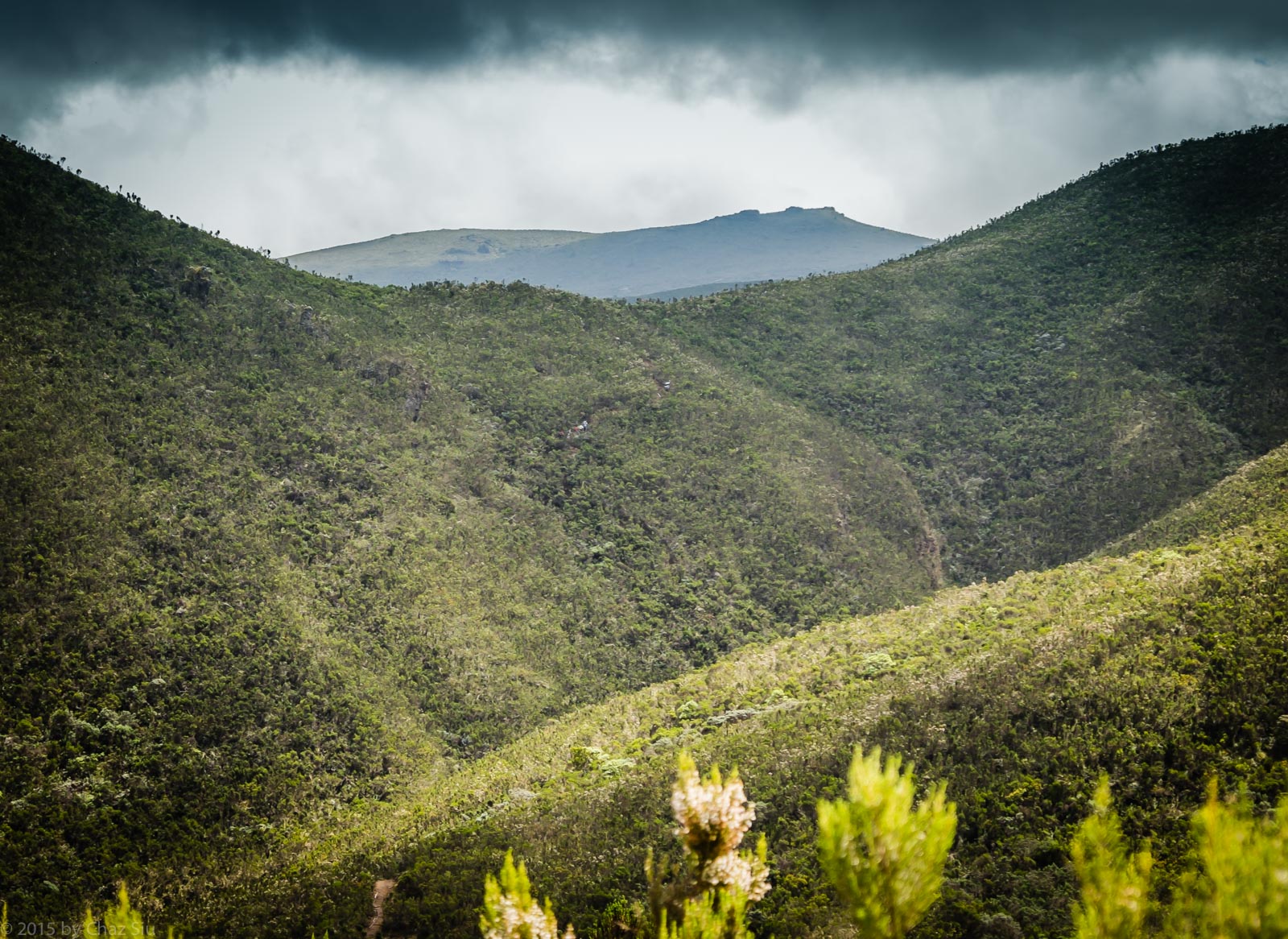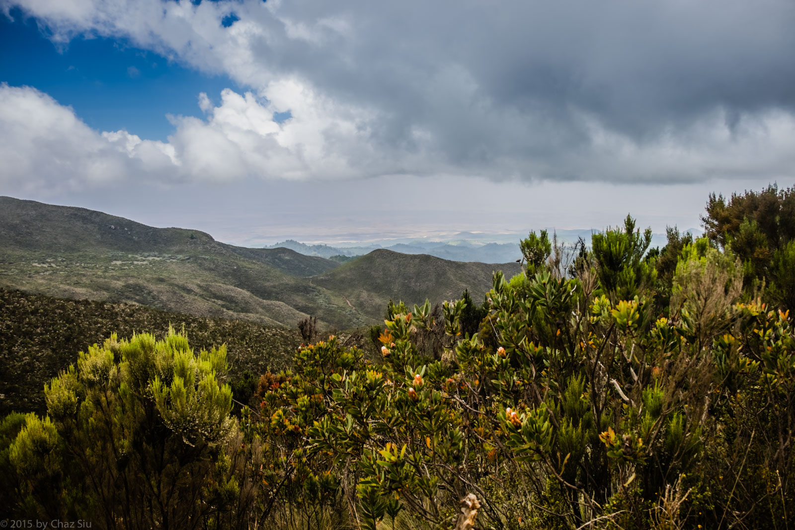 Lunch On The Ridge To Shira One Camp. Left of the ridge is the view down to the Tanzanian plains, while on the right, the edge of the Shira Plateau. Note the looming storm clouds that would soon make themselves known.