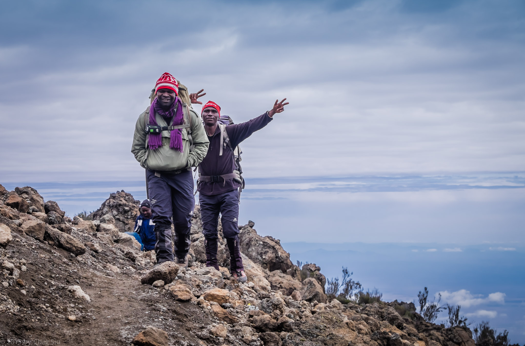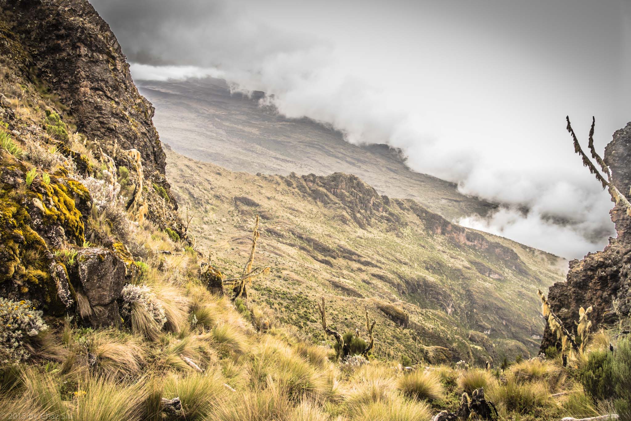 Looking to the East we see the miles of plateau we just traversed spread before us, while mist floats so heavy up top, we can’t see just how far and deep the other side of the Cathedral is (all the way down to the plains below, we see later from Shira Hut). First group photo, and we head back down to the saddle.