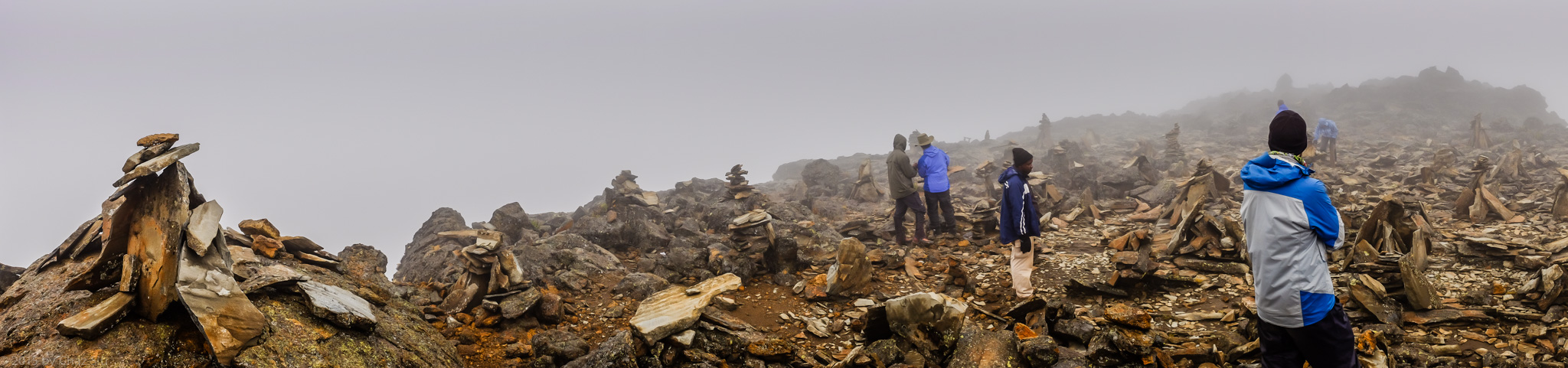 No surprise, we were once again shrouded in mist, with limited views below. About 45 minutes out of camp, we took a 100 foot boulder scrambling detour up the lowest of three Lent Hills [13,728 feet], where the biggest cairn forest we’d yet seen awaited us.