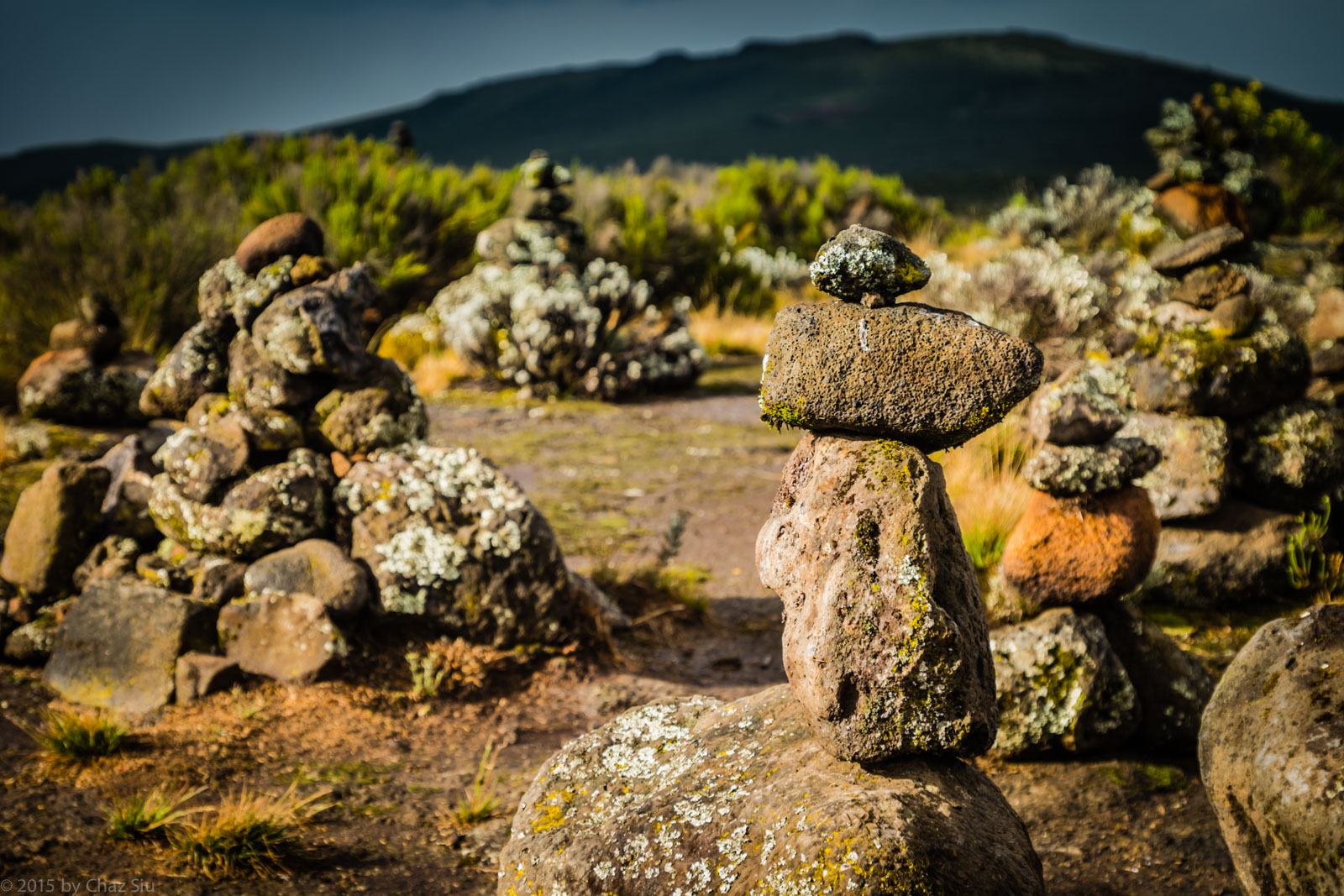 As we hit the ridge top at 11,500 feet, it starts to rain. At first we balk putting on rain gear, which traps in heat during our climb, but then it starts coming down hard and we throw on the ponchos, rain pants, and pack covers and move out. At least we’re now in a lateral and slightly downward traverse, but as Viviano steps up the pace, the rain starts pounding the path into mud puddles. As we descend the final quarter mile into camp, the rain turns to a mix of hail, sleet, and rain, hammering pellets off of us. We get into camp, and huddle under the sign in hut, watching the porters try and setup our tents. Unfortunately, just as we make a beeline for the tents and get in, the rain is washing under some of the tents, causing them to float. While we hide in the mess tent, the porters move all the gear out and move the tents to better ground, frantically digging shallow shovel ditches around each tent to channel the water. An hour later, the rain finally stops. Cort, Caryl and I go 200 paces back up the trail to see a cairn forest we’d run past while inbound.