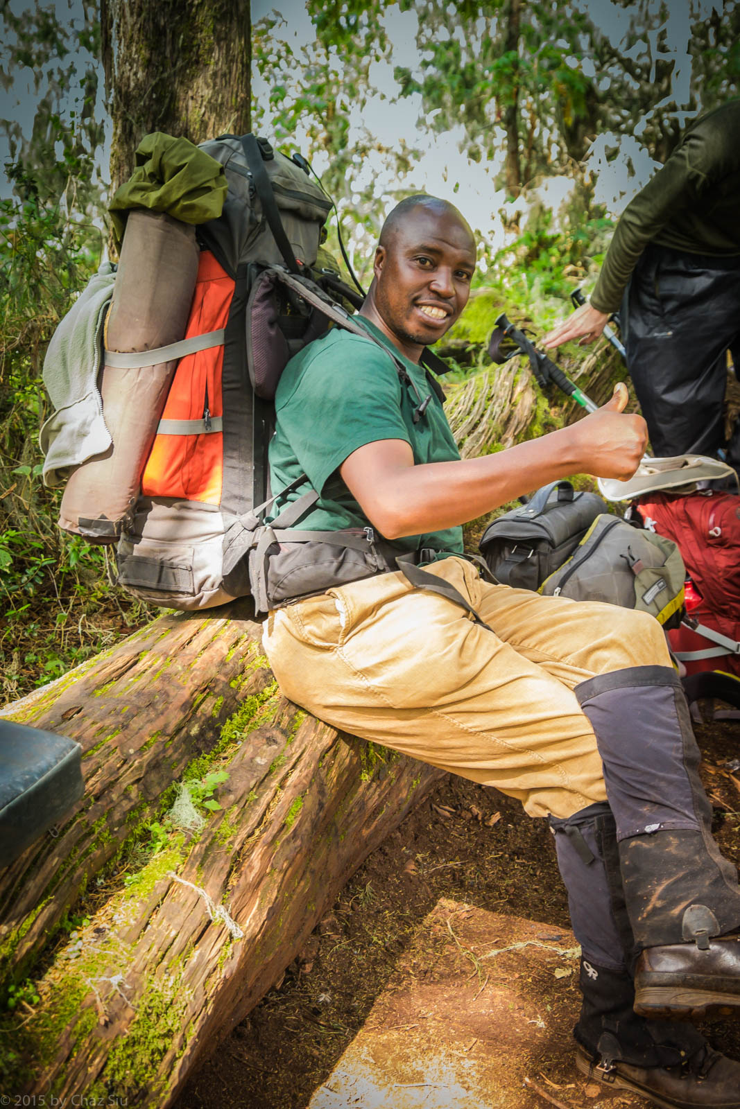 As we climb pole pole out of the rainforest, the lush green of the forest melts away to shorter heather, still thick, but our visibility increases. We begin to be overtaken by a stream of porters with the camp on their heads, again headed out in front of us to setup camp by the time we get there. We rotate behind Viviano and pepper him with questions about various striking plants we see along the way indigenous to the region and altitude.