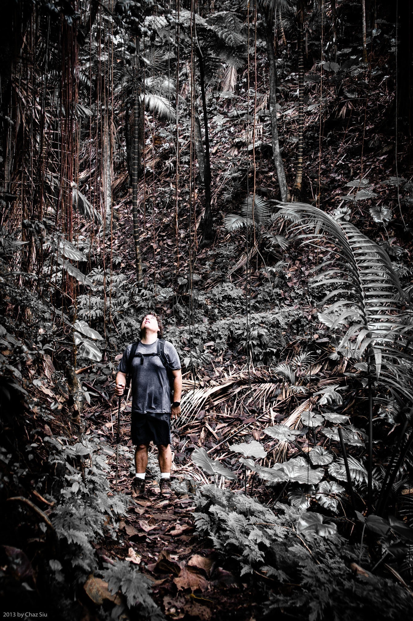 In post processing for this picture,I desaturated the overwhelming green of the rainforest to get the red browns of the trail and the swinging vines to pop out around my brother. Michael is an exceptional photographer himself–check out his photos here–and we both dug the result, so here it is for your viewing pleasure.