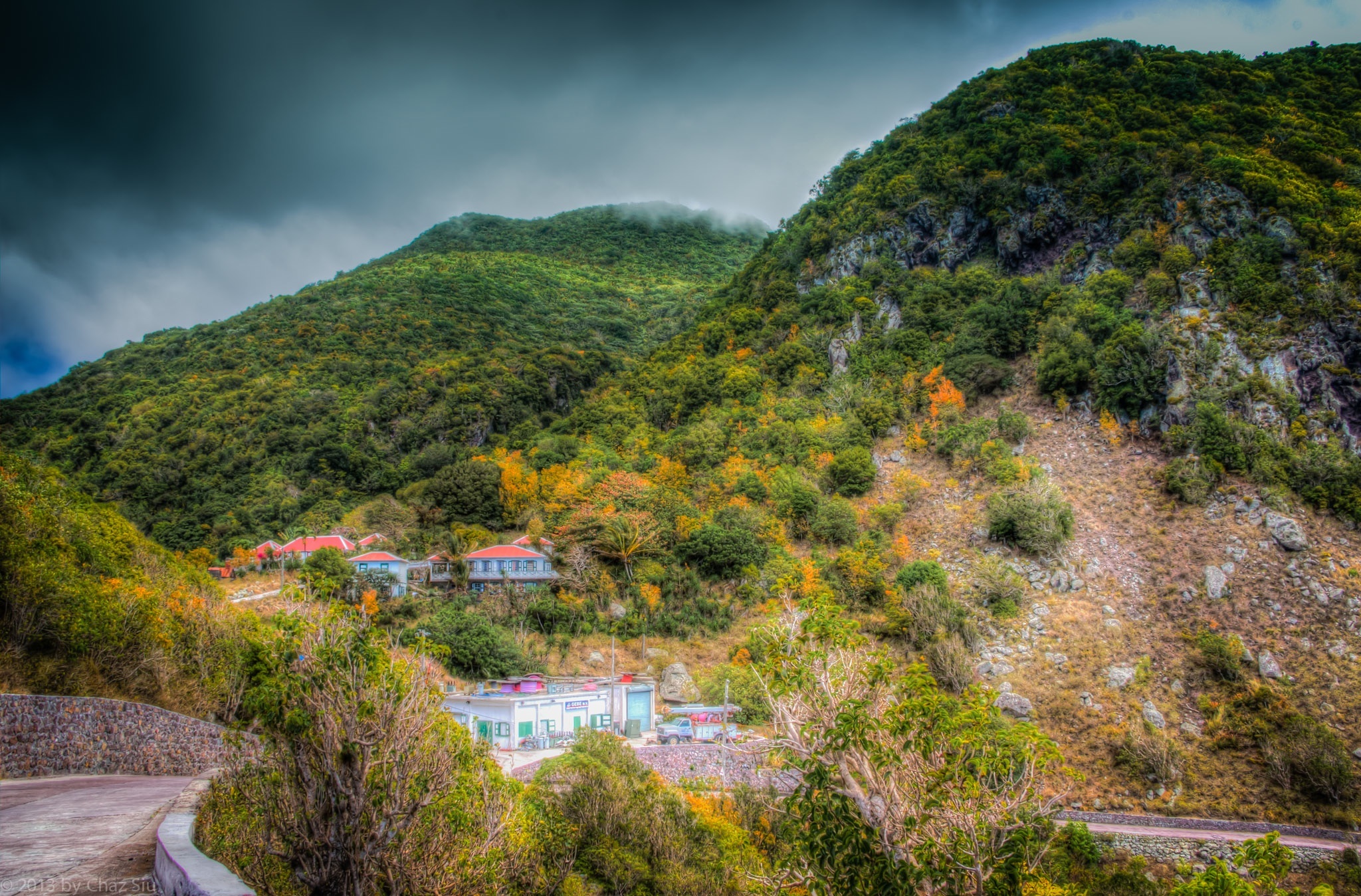 My time is ticking, running out here on Saba, and just when I think I’ve run out of images to show, I confront The Road I take to Windwardside from St John’s every day, often 3-4 times a day, and see an artistic perspective I didn’t catch before. That’s today’s pic, the descent out of St John’s after I climb out of the Flat, and bend around past the old GEBE station, where the plaintive bleats and brays of goats on the ridges and cliffs continues, the wind sometimes moans in the cleft between the mountains, and the fog tops Mt Scenery. I dig this place, I really do. Guess I’ll be back in a few years…